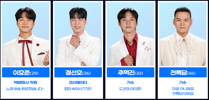 현역 가수들의 블라인드 오디션도 화제였습니다. 'K-트롯'의 새로운 지평을 열어가는 이들의 도전은 프로그램의 품격을 한층 높였습니다.