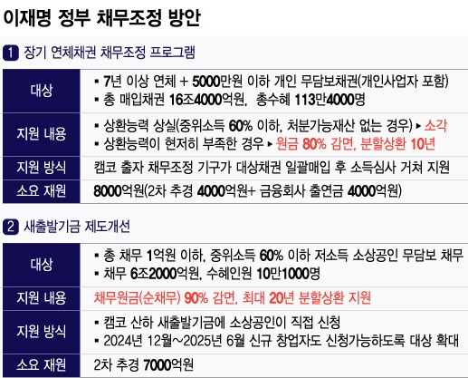 이번 채무조정 프로그램은 7년 이상 연체된 5000만원 이하의 개인 부채를 대상으로 합니다. 한국자산관리공사(캠코)가 주도하는 채무조정 기구는 총 16조 4000억원 규모의 연체채권을 매입하여 채무자들의 경제적 재기를 지원할 예정입니다.