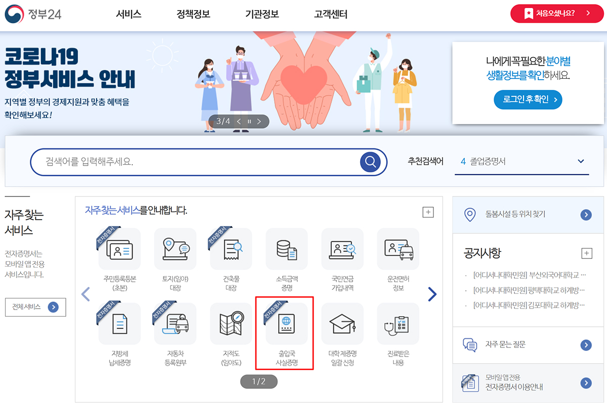 2. 홈페이지에 접속한 후, 자주 찾는 서비스에서 출입국 사실증명 메뉴를 클릭합니다.
