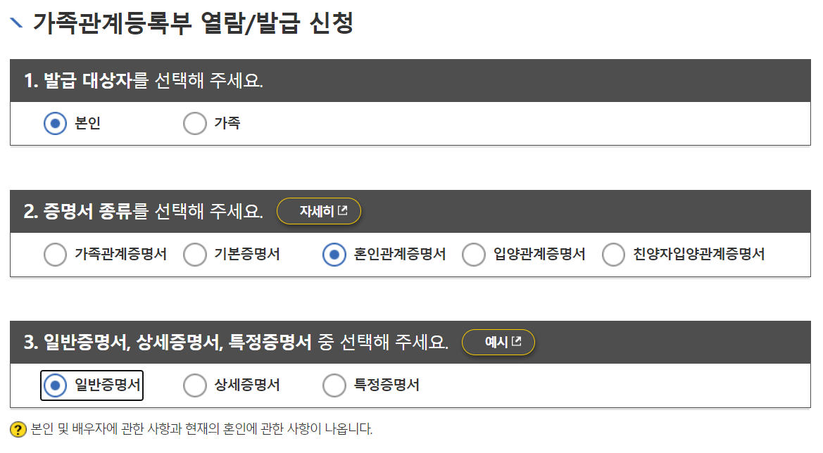 종류: 일반(본인 및 현재 배우자만 기재), 상세(혼인, 이혼, 재혼 등의 사실 모두 기재), 특정(특정 배우자와의 관계만 기재)