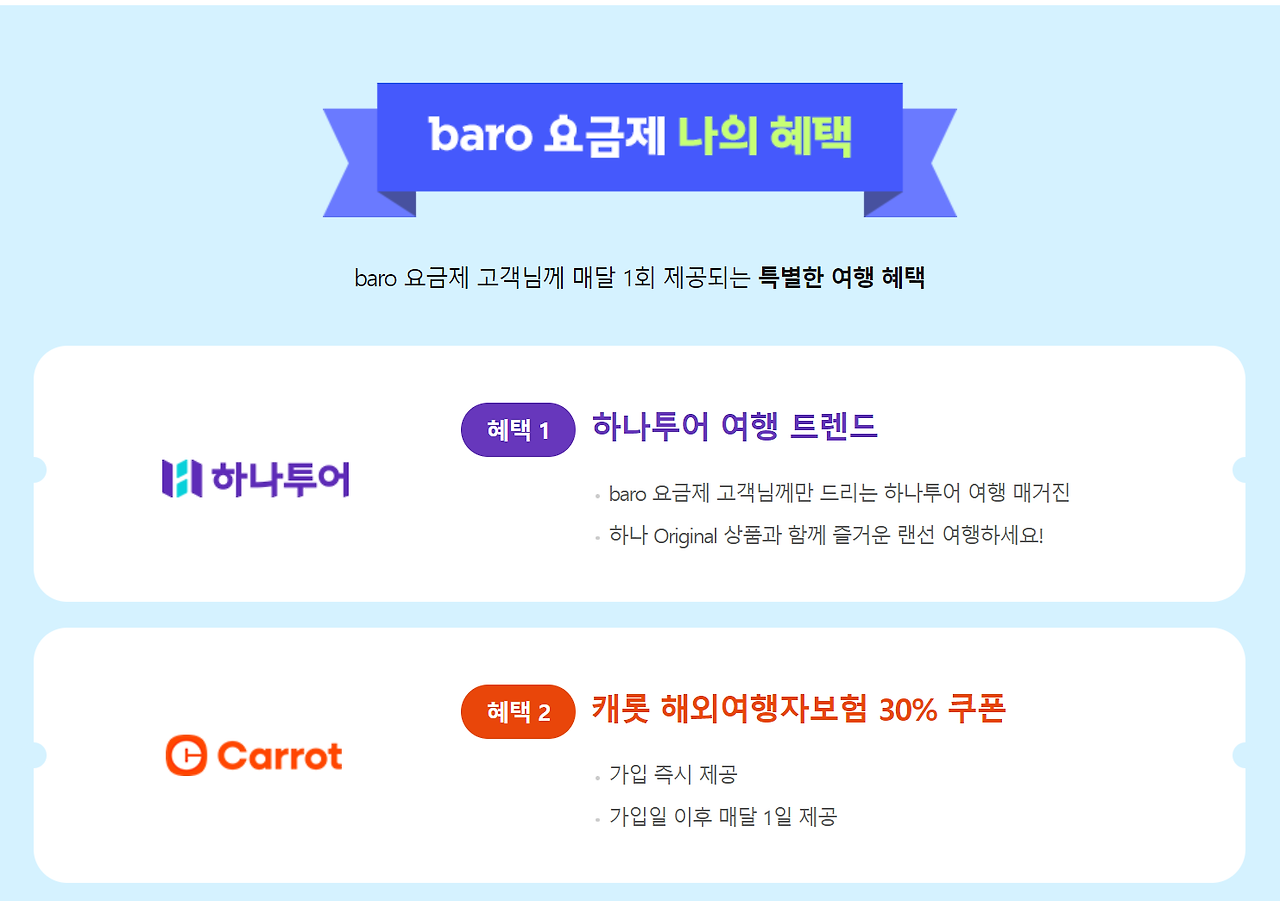- Baro 요금제: 데이터 로밍과 무료 음성통화 제공