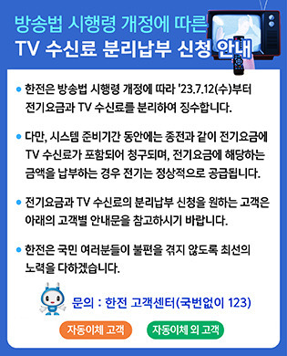 - 납부 방식: 전기요금과 통합 고지 또는 별도 납부